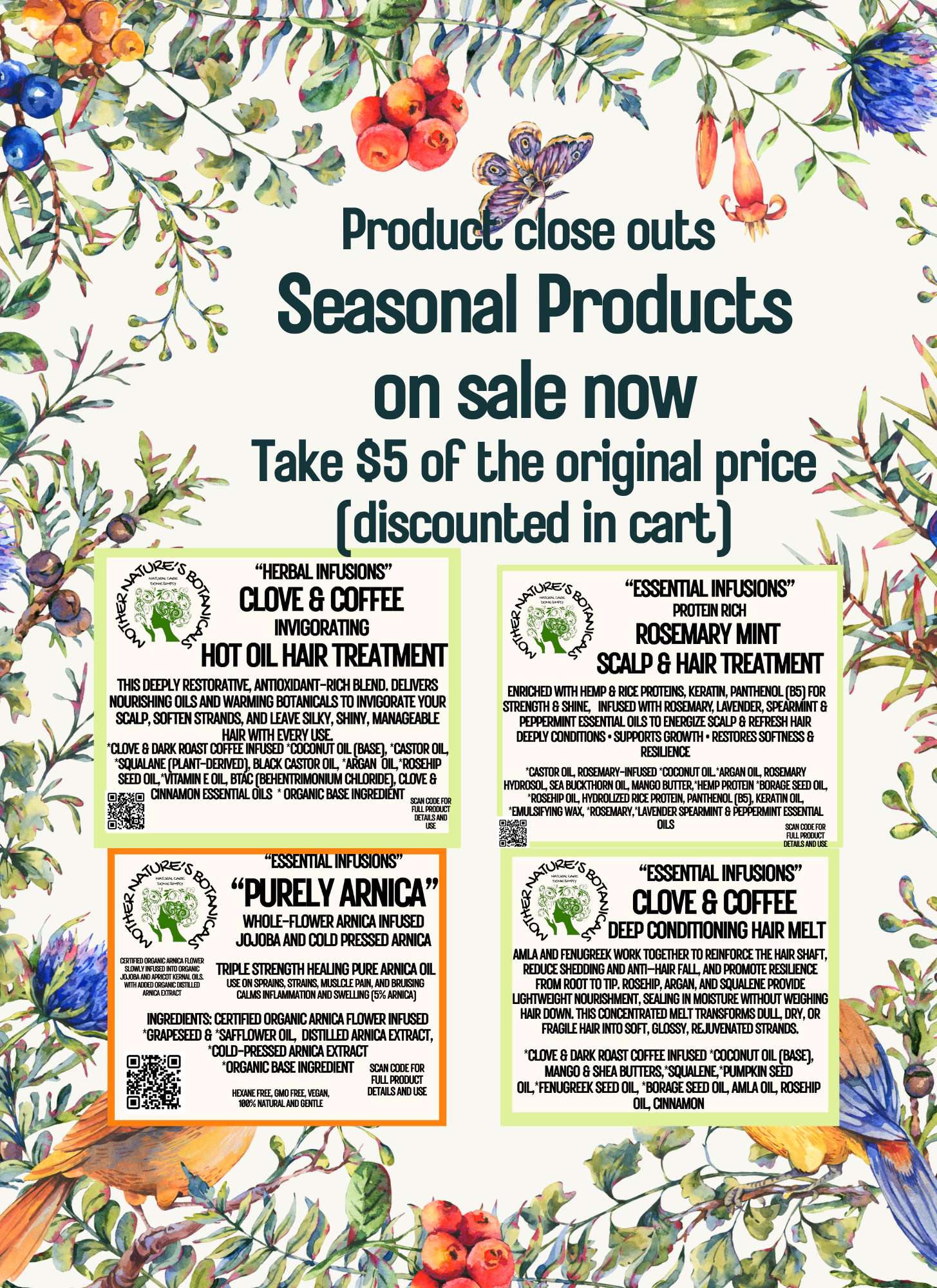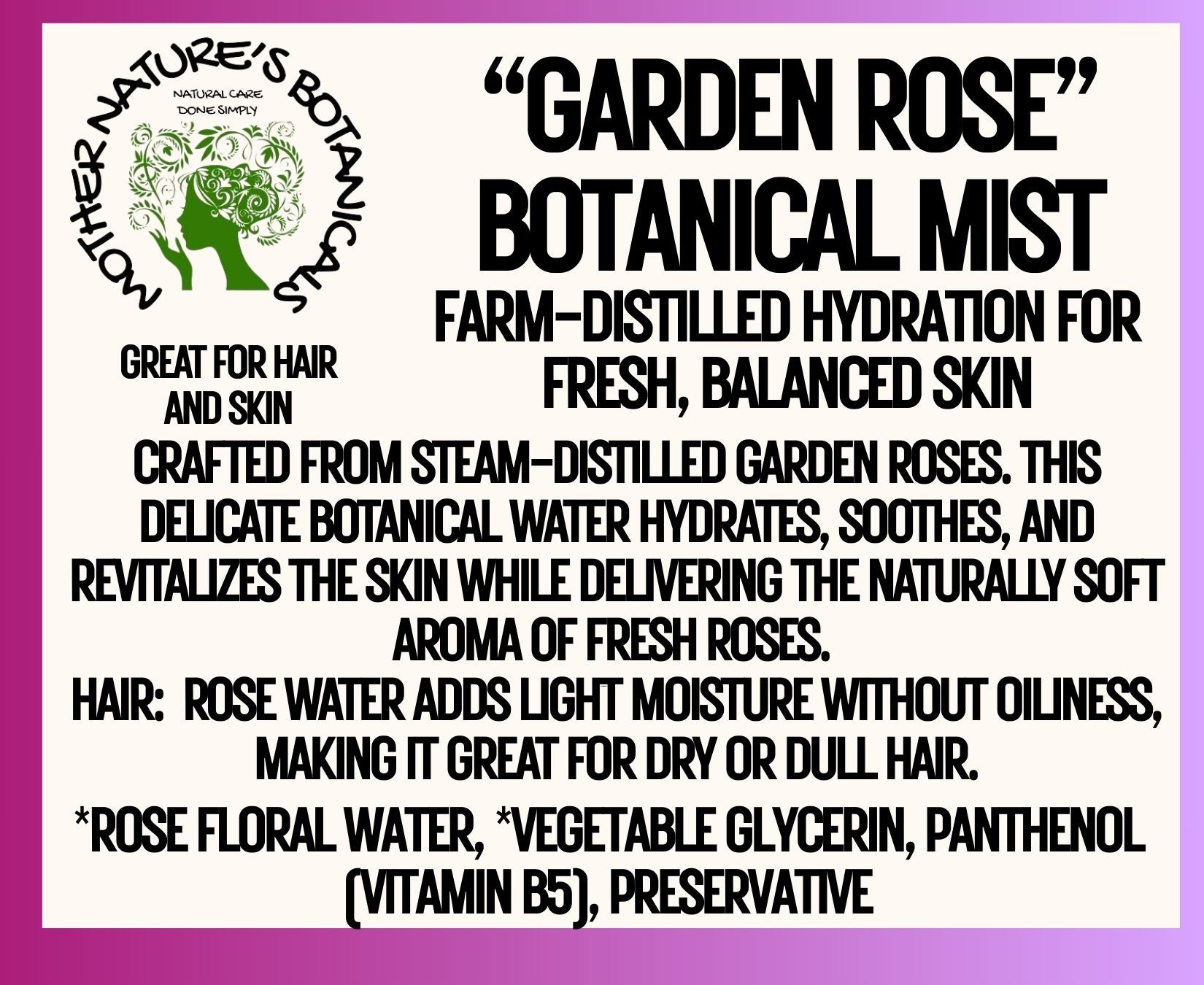 Over the past year, I’ve taken the time to thoughtfully revisit and refine my entire product line. Every updated formula has been improved for better texture, consistency, stability, and overall performance — while staying true to the clean, botanical integrity that Mother Nature’s Botanicals is known for. This process wasn’t about changing what worked. It was about listening, learning, and making good formulas even better. If you’ve tried one of my products in the past and it wasn’t the right fit, I warmly invite you to give the revised formulas another try. Every product is crafted in small batches with intention and is backed by a satisfaction or money-back guarantee. Thank you for supporting small-batch, ever-evolving natural care.