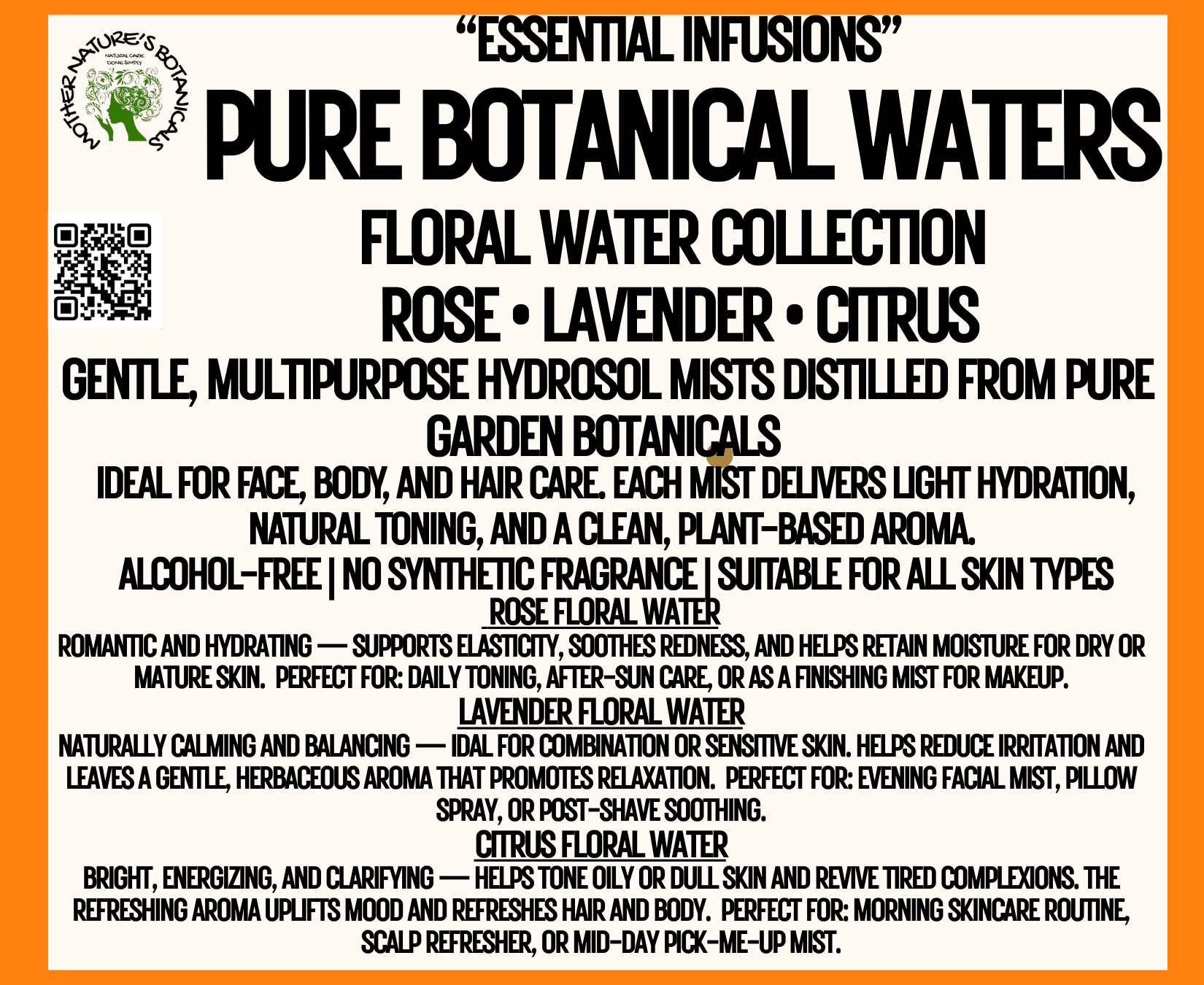 Because of their fine particle size, hydrosols deliver nutrients evenly and deeply without clogging pores, making them ideal for sensitive or reactive skin. Unlike concentrated essential oils, they are mild, soothing, and safe for direct use on skin and hair.