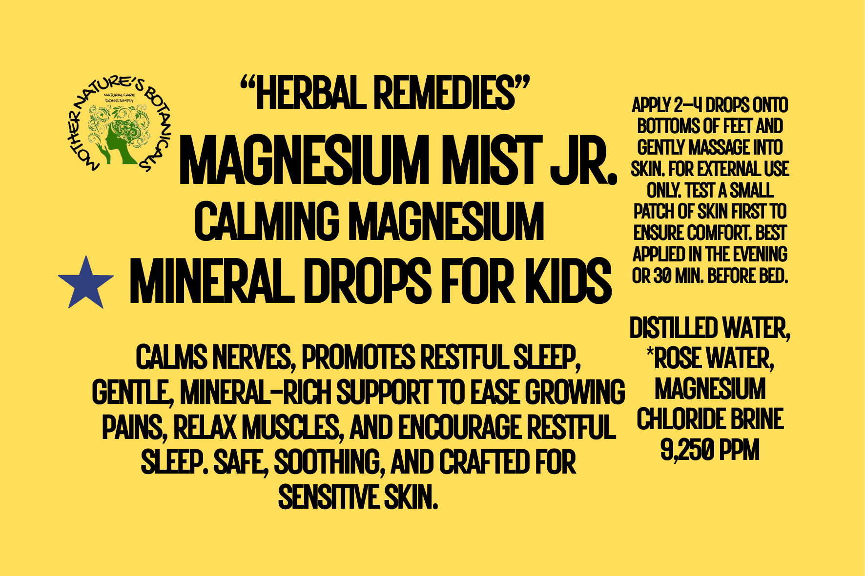 Magnesium Mist Jr. is a mild, child-friendly topical spray crafted from pure magnesium chloride brine, rose floral water, and aloe vera juice to help calm restlessness, soothe tired muscles, and promote deep relaxation. The gentle mineral absorption supports growing bodies and helps reduce tension — naturally.
